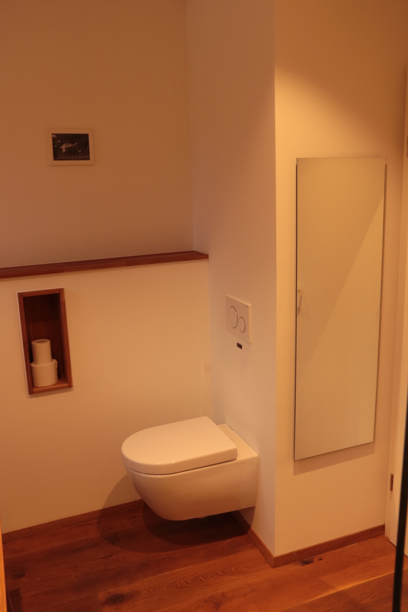 Eine geräumige Dusche bietet den nötigen Platz für ein erfrischendes Duscherlebnis, während ein modernes Waschbecken und eine gut platzierte Toilette für den Komfort sorgen. Ein großer Spiegel ermöglicht es, sich vor dem Ausgehen zurechtzumachen, und ein Fön ist das i-Tüpfelchen.