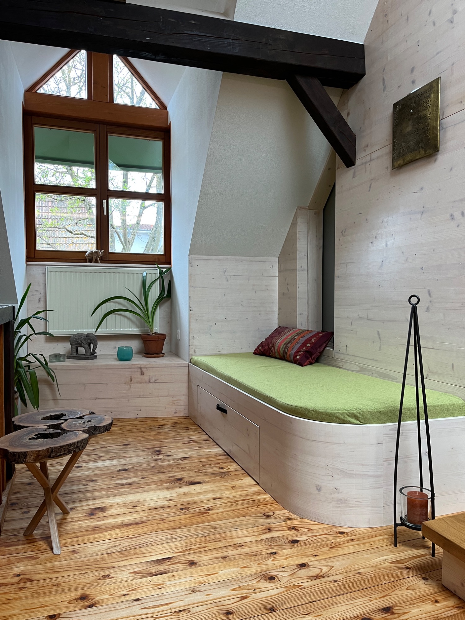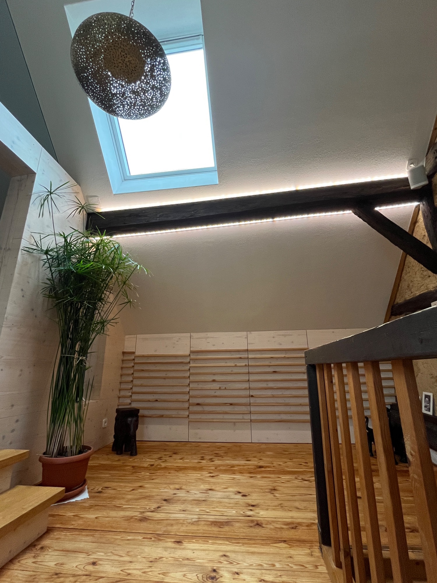 Im Ziegenstall erwartet Sie im Obergeschoss eine gemütliche Chaiselongue, die perfekt für einen Rückzug nach einem erlebnisreichen Tag ist. Hier können Sie entspannen und wohlfühlen, umgeben von einer Oase der Ruhe. Die liebevoll ausgewählten marokkanischen Leuchten schaffen eine warme, einladende Atmosphäre. Zudem bietet der Schrank ausreichend Platz für Ihre Wäsche sowie die notwendigen Reinigungsutensilien und zusätzliche Handtücher, sodass Sie ihren Aufenthalt in vollen Zügen genießen können.