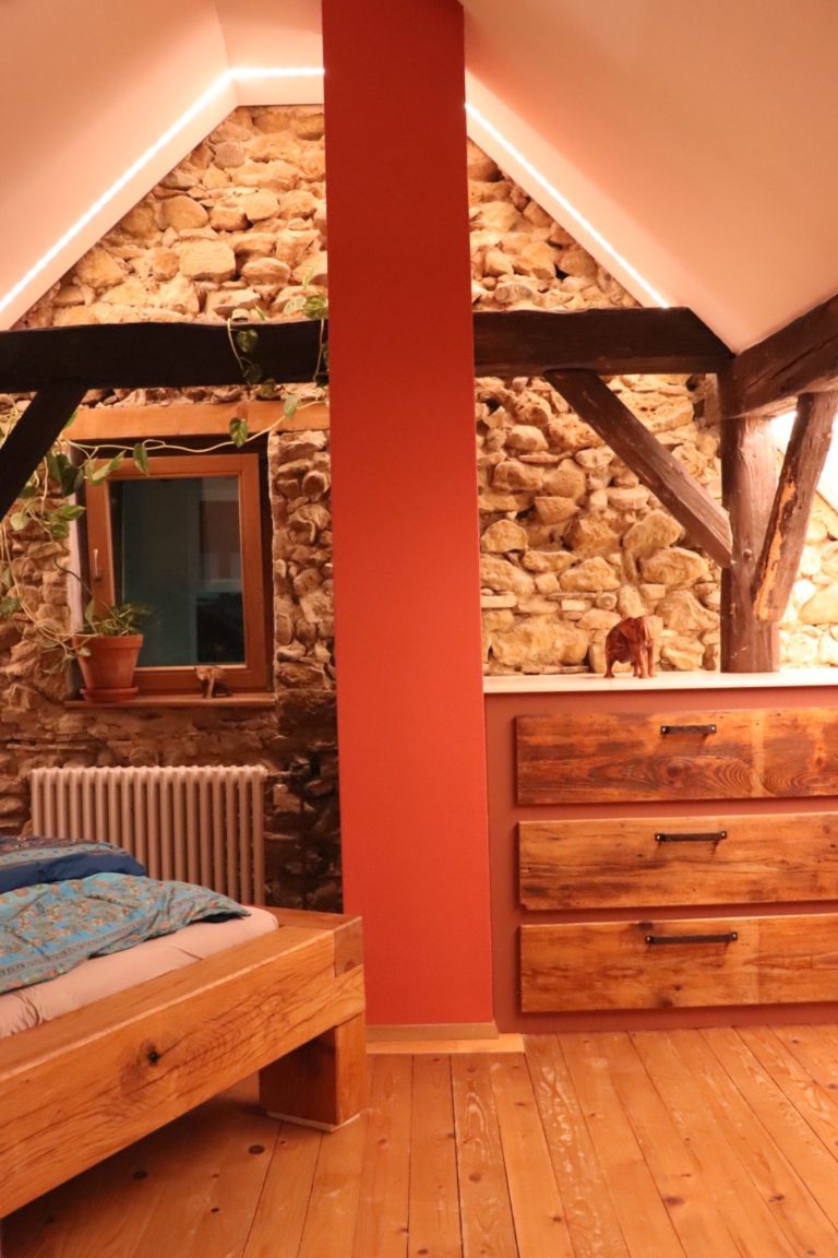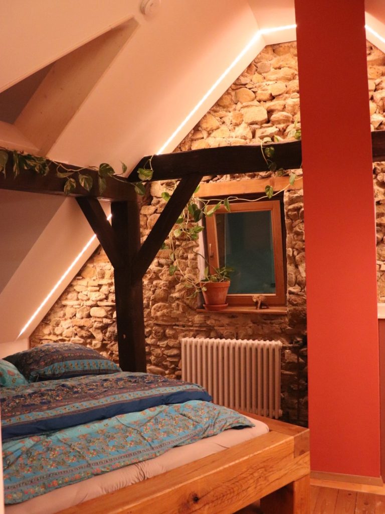 Die subtile Beleuchtung betont die charmante Bruchsteinwand die Geschichten aus alten Zeiten zu flüstern scheint. Überall wimmelt es von praktischen Ablagen – perfekt für all die geheimen Schätze, die ein Schlafabenteuer so braucht! Auf einer gemütlichen Fläche von 1,4 x 2,0 m ist ausreichend Platz für schöne Träume